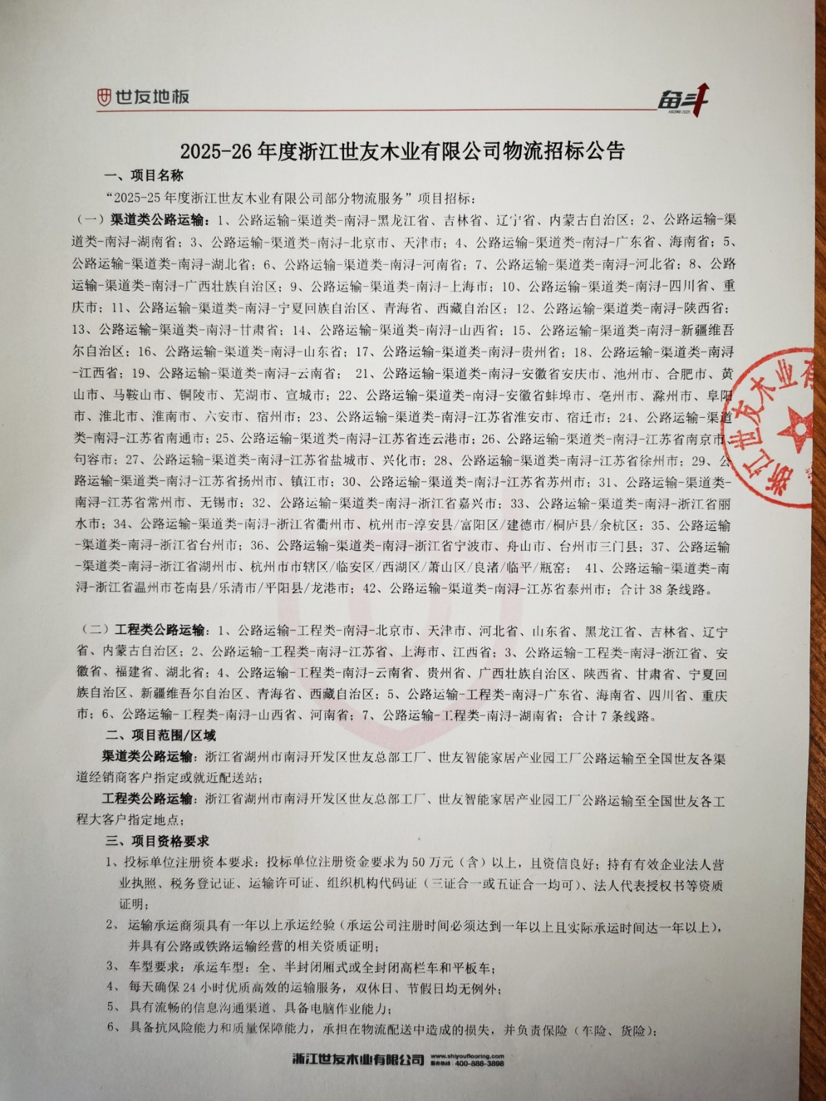 2025-26年度浙江世友木業(yè)有限公司物流招標(biāo)公告